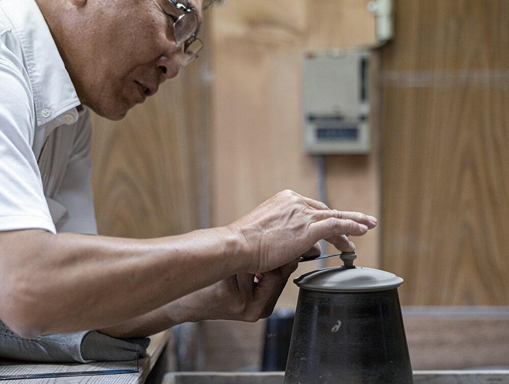 胴、口、手、蓋、つまみ、茶こしの6パーツからなる。パーツごとに石膏型があり、職人の手によってつくられています。