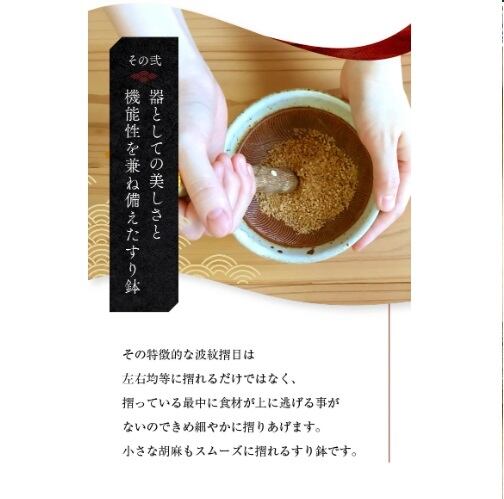 お客様から左利き用のすり鉢を作ってほしいと頼まれたことがきっかけで、 左右どちらの方向に回しても、しっかりと櫛目にあたり、力を入れずスムーズにすれる波紋櫛目を開発。 この「波紋櫛形すり目」により、すり鉢の力を最大限に引き出すことができます。 擂るときの摩擦熱が少なく、食材の香りを十分に引き出すことができます。 またあまり力を入れなくてもスピーディーに、 右利き、左利きに関係なく擂ることができるように設計されています。 すり目にはガラスの粉を混ぜた釉薬が塗られています。 これにより一層堅く、しっかりとした摩擦力が生まれ、すり鉢自体が長持ちします。 ???波紋櫛目??? 波紋擦目は左右均等に擦れるだけではなく、 擦っている最中に食材が上に逃げる事無くきめ細やかに擦りあげます。 小さな胡麻もスムーズに擦れるすり鉢です。離乳食作りにもおすすめです。